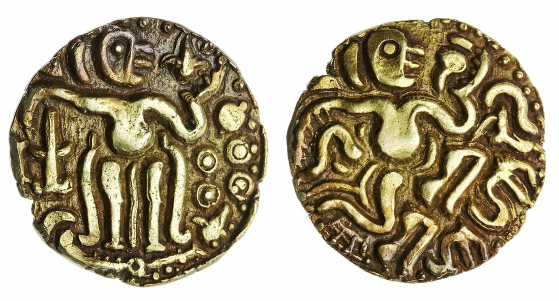 It is thought that these coins were struck following Raja Raja's invasion of Ceylon in 1001, specifically for use on the island. Its design follows closely the gold Kahavanus struck in Ceylon prior to this time (type III). Kahavanus attributed to the Cholas of late 10th century Tamil Nadu were struck in silver and did not feature the standing or seated figures that so characterise Celyon coins of the period.