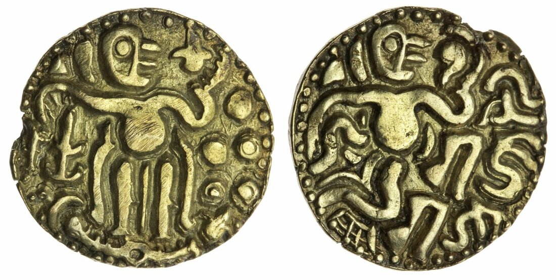 Sri Lanka (Ceylon), conquest of Raja Raja Chola (985-1014), base gold/silver Kahavanu, 4.30g, standing figure of Ceylon style, holding a flower right, lamp stand under arm in left field, four annulets with a solid bead above in right, rev. figure seated right, holding a conch shell right, Devanagari legend in right field Sri Raja Raja (Codrington 104; Mitchiner, Southern India, part 2, 318), edge damage at 1 o'clock, extremely fine, rare
