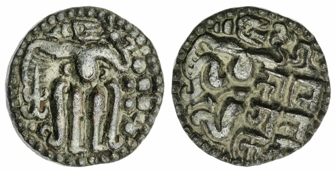The cataloguer has not had the opportunity to test one of these coins for their metal contact, so I am grateful to refer to https://coins.lakdiva.org/ that lists a base silver Nikkha of the same type with an XRF reading of 15.7% silver, 79.3% copper and impurities, 2.8% gold, 1.2% nickel and 1.0% platinum