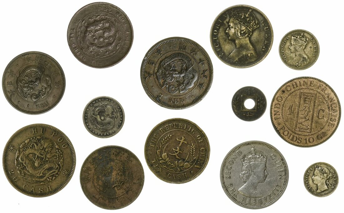 China, Provincial Coinage Kwang Tung, 72-Candareens, Hu Poo, AE 20-Cash, 10-Cash (2), of Tai Chin and Republic, AE 2-Sen, Cash (2), fine to very fine; Chinese Turkestan, Kau Tsung / Ch'ien Lung (1736-95), Cash, Ushi, Sinkiang, Hsuang Tsung (1821-51), 10-Cash, Aksu, fine; Hong Kong, Dollar, 1960H, 10-Cents, 1897, 5-Cents, 1891, AE Cent, 1901H, 1-Mil, 1866 (KM 3, 4.3, 5, 6.3, 31.1); French Indo-China, AE Cent, 1892A (KM 1), extremely fine with lustre (15)