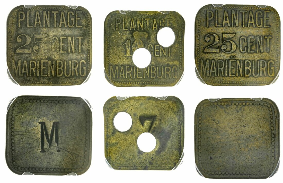Netherlands East Indies, Suriname, Plantation Tokens, Plantage Marienburg, group of 3 brass tokens, 10-Cents, 25-Cents (2), undated (1880-1890) (Byrne T25/T26, Rulau 15/16), all graded PCGS XF Detail (Environmental Damage, Scratch and Cleaned) respectively (3)