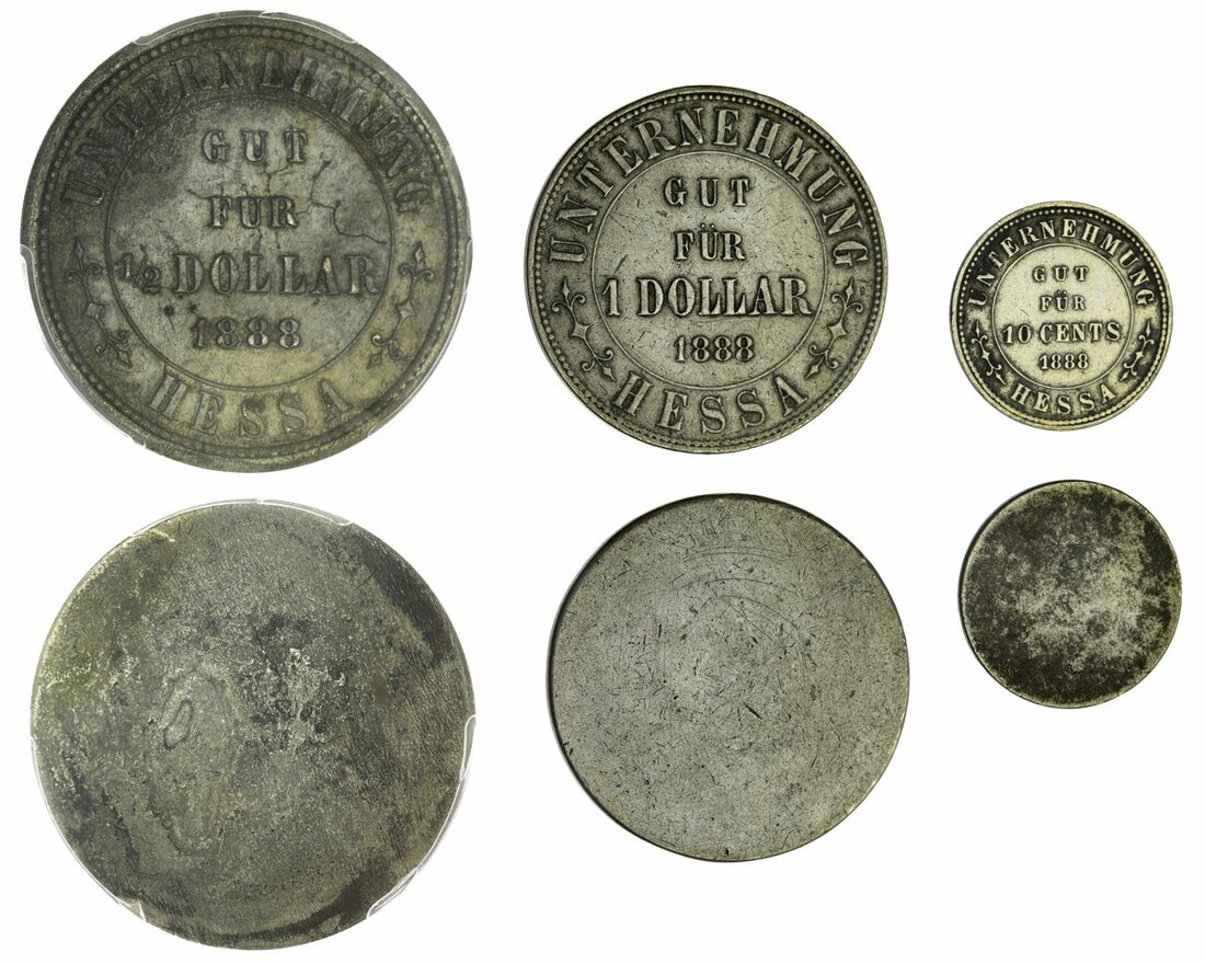 Netherlands East Indies, Sumatra, Plantation Tokens, Unternehmung Hessa, group of 3 uniface nickel tokens, 1-Dollar, ½-Dollar, 10 cents, all dated 1888 (LaWe 97, 100, 103/104; Scholten 1063, 1064, 1066), the first very fine, the second PCGS AU Detail (Environmental Damage), the last extremely fine (3)