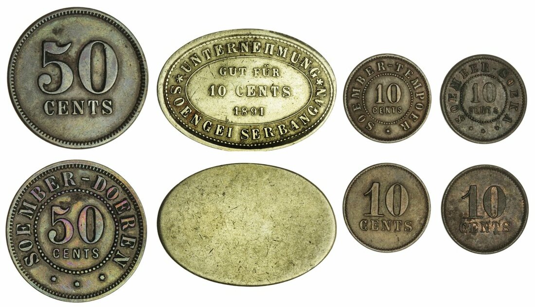 Netherlands East Indies, Sumatra & Java, Plantation Tokens, Soember-Soeka, 10-Cents, Soember-Tempoer, 10-Cents, Soember-Doeren, 50-Cents, all undated, and Unternehmung Soengei Serbangan, 10-Cents, 1891 (LaWe-350, LaWe-unlisted, LaWe-333, LaWe-421), the first three extremely fine or better, the last very fine, all rare (4)