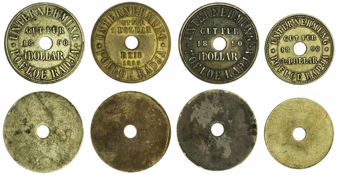 Netherlands East Indies, Sumatra, Plantation Tokens, Unternehmung Poeloe Radja, group of 4, brass 1-Dollar-reis, nickel-alloy 1-Dollar and copper 1-Dollar, nickel-alloy 1/2-Dollar, 1890 (LaWe 210b, 211, 212, 218), very fine to good extremely fine, the copper Dollar with stronger toning, rare (4)
