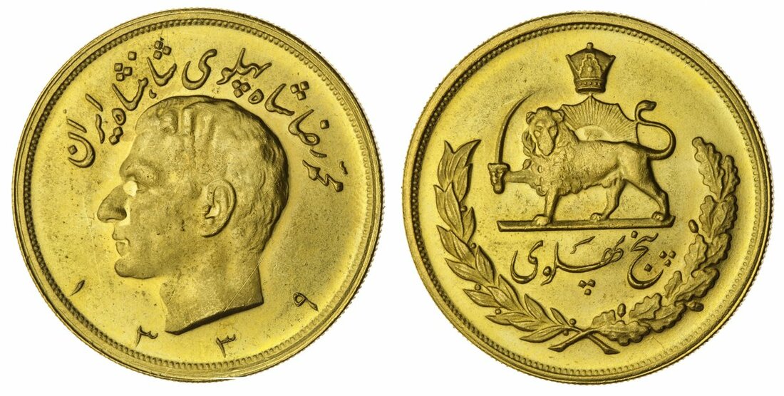 (g) Persia, Pahlavi Dynasty, Mohammad Reza Shah (1941-79), gold 5-Pahlavi, 40.68g, SH1339 (1960), head of Muhammad Reza left, date below, rev. crown above radiant lion standing left holding sword, wreath below (KM 1164), about uncirculated