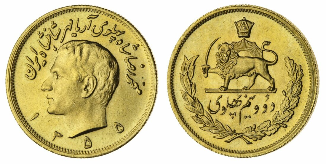 (g) Persia, Pahlavi Dynasty, Mohammad Reza Shah (1941-79), gold 2½-Pahlavi, 20.30g, SH1355 (1976), head of Muhammad Reza left, date below, rev. crown above radiant lion standing left holding sword, wreath below (KM 1201), good extremely fine