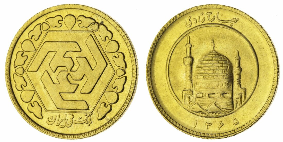 (g) Iran, Islamic Republic, gold Azadi, SH1365 (1986), mosque, rev. hexagonal design (KM 1248.2), uncirculated