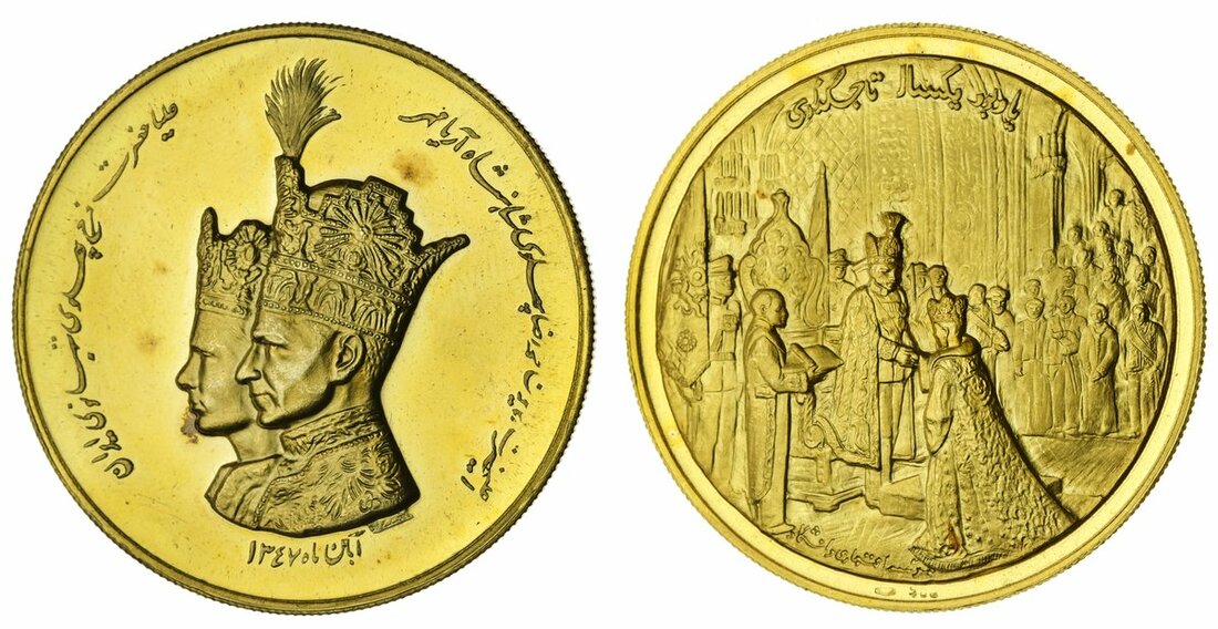 (g) Persia, Pahlavi Dynasty, Mohammad Reza Shah (1941-79), gold proof Medallion, 25.12g, SH1347 (1968), conjoined busts of the Shah and Empress Farah Diba, both wearing ornate crowns, rev. coronation scene, the Empress kneels before the Shah, a couple of spots, brilliant proof finish, good extremely fine