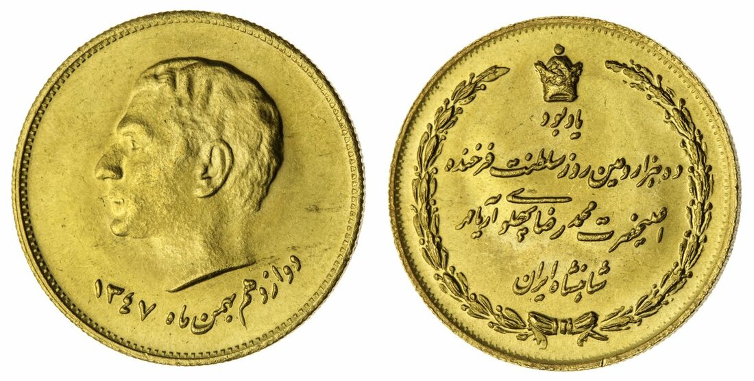 (g) Persia, Pahlavi Dynasty, Mohammad Reza Shah (1941-79), gold Medallion to weight of a 2½-Toman, 20.40g, SH1347 (1968), in celebration of the 1000th day of reign, bust of Shah left, rev. legend within wreath, bust with uneven finish, about uncirculated