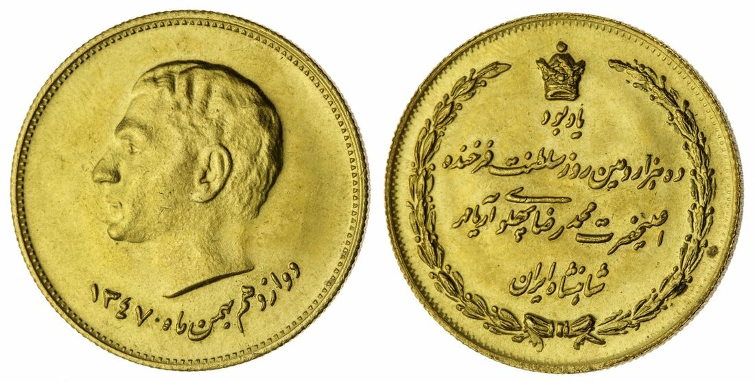 (g) Persia, Pahlavi Dynasty, Mohammad Reza Shah (1941-79), gold Medallion to weight of a 2½-Toman, 20.32g, SH1347 (1968), in celebration of the 1000th day of reign, bust of Shah left, rev. legend within wreath, bust with uneven finish, about uncirculated