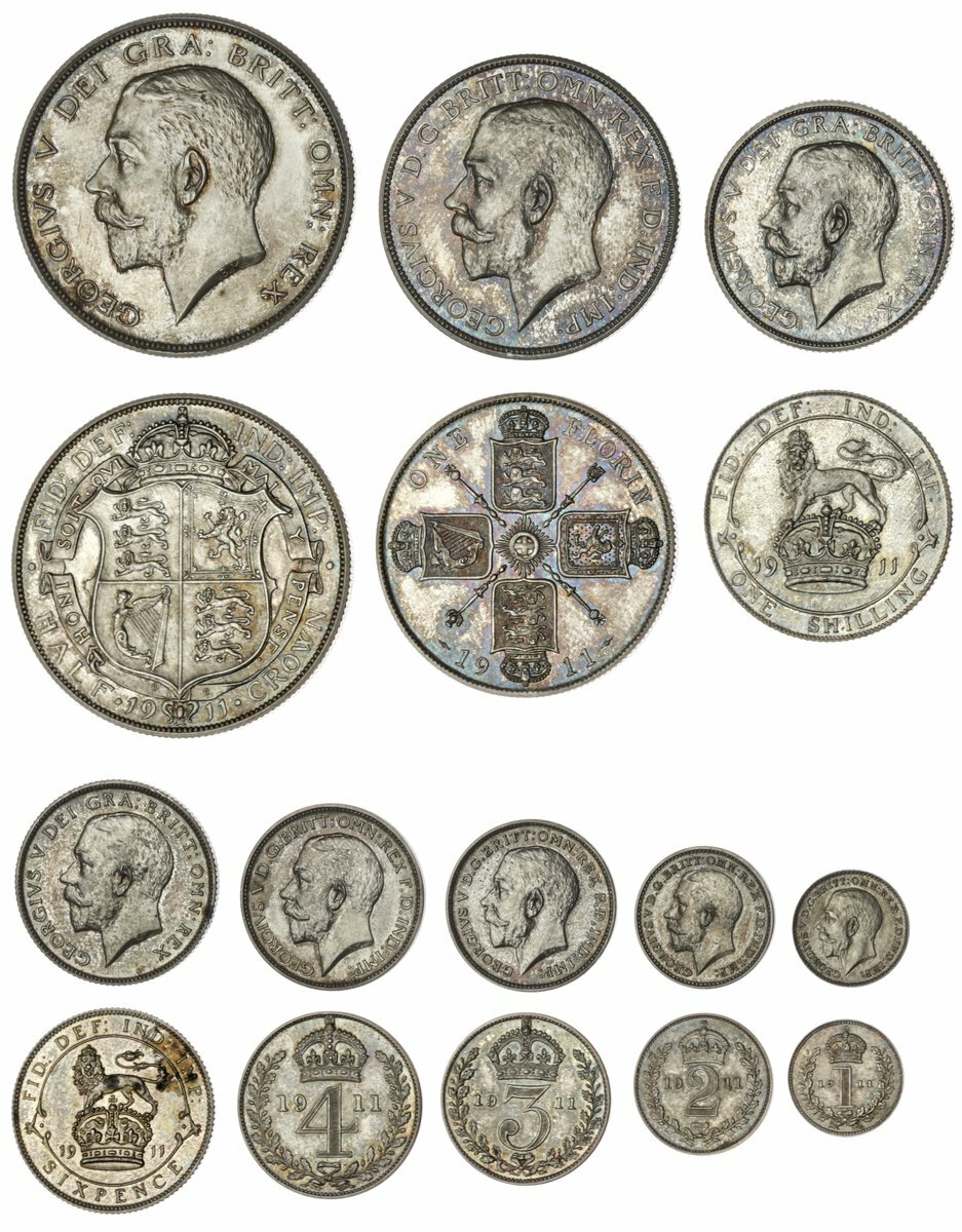 George V (1910-36), Coronation Specimen Silver set, 1911, Halfcrown, Florin, Shilling, Sixpence, Maundy Fourpence, Threepence, twopency and Penny (Spink PS13), Halfcrown lightly wiped, Shilling and Threepence with flecks of discolouring, otherwise as struck and lovely patinated, in 10-coin set box of issue. (8)