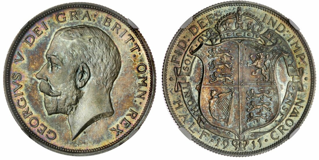 George V (1910-36), Proof Halfcrown, 1911, bust left, rev. crowned, ornate shield within garter (Spink 4011; ESC 3710(758)), as struck with a lovely rirdescent toning, in NGC holder PROOF 67, cert. #4327656-007