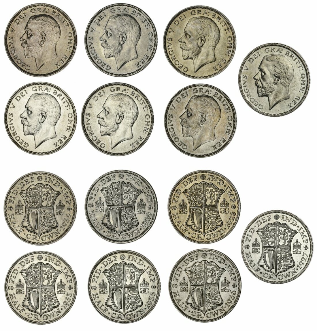 George V (1910-36), Halfcrowns, Fourth Coinage, 1927, 1928, 1929, 1934, 1935(2), 1936 (Spink 4037), good extremely fine to uncirculated.(7)