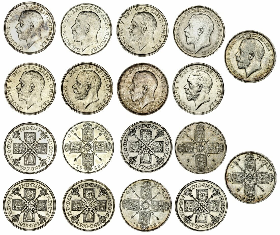George V (1936-52), a series of Florins, 1914, 1918, 1913, 1925, 1927(proof), 1929, 1930, 1931, 1935 (Spink 4012, 4022A, 4038), 1914 good very fine, 1927 obverse lightly wiped, otherwise about uncirculated and uncirculated, a lovely group). (9)