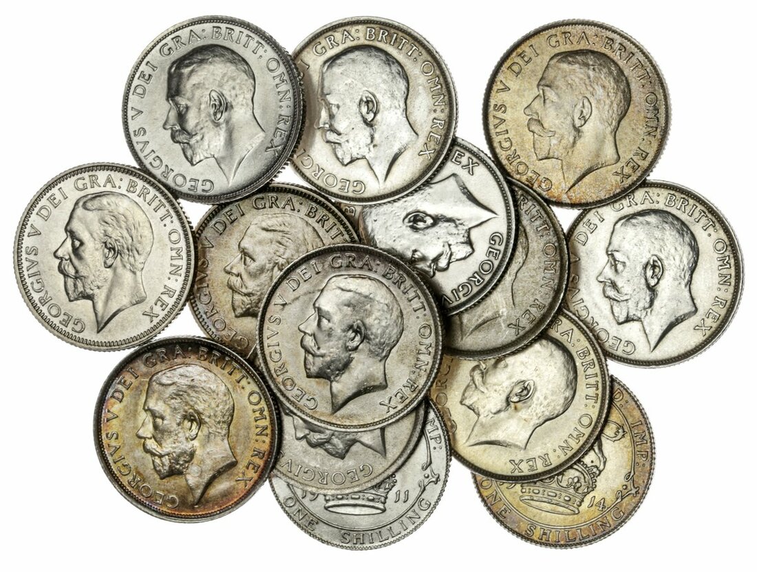 George V (1910-36), a group of Shillings, consisting of 1911, 1914, 1915, 1916, 1917, 1918, 1919, 1923, 1929, 1932 (Spink 4013, 4023A, 4039), conditions uncirculated or near so; with duplicates, 1916(3), 1918(Spink 4013), all cleaned, other wise around very fine. (14)