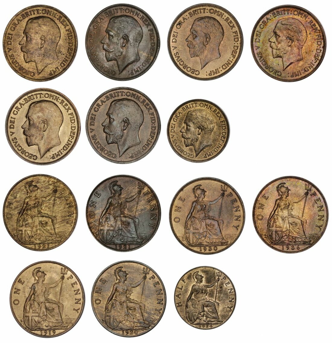 George V (1910-36), Pennies, 1919, 1920, 1921, 1921, 1930, 1936; with Halfpenny 1924 (Spink 4051, 4055, 4056), about uncirculated or better, a lovely group.(7)