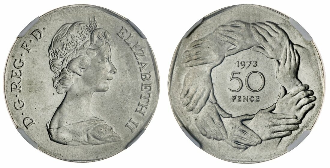 Elizabeth II (1952-), Decimal New 50-Pence, 1973, struck on a cupro-nickel Ten Pence flan, edge plain, 11.37g, 12h (cf. Spink H2), much as struck, with hints of the rim to peripheries, an unusual error, in NGC 'Francis' holder, graded MINT ERROR ~ MS63 (Cert. #5878644-017)