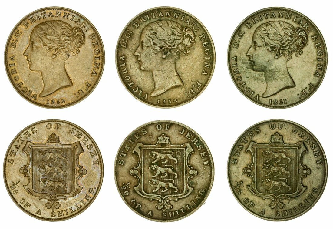 Jersey, Victoria (1837-1901), Twenty-Sixth of a Shilling, 1858 (2); 1861, copper issues (Pridmore 32, 33; S.7002), the first lustrous, with mint colour in recesses, near extremely fine, the second fine, the last with staining, very fine (3)