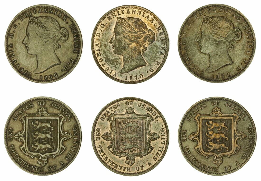 Jersey, Victoria (1837-1901), Thirteenth-Shillings, first bronze issues (3), 1866; 1870; 1871 (Pridmore 9-11; KM 5; S.7004), the first and last good fine, the latter with some rub to reverse, the second with good original mint red, but with surface PVC staining, very fine (3)