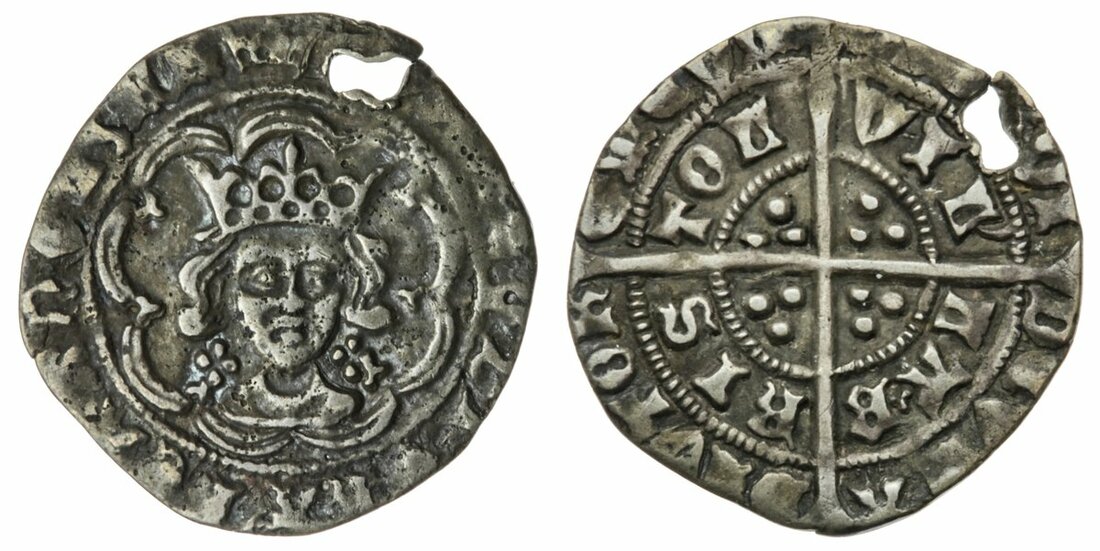 The Abramson Collection of English Coins | Edward IV, First Reign (1461-1470), Halfgroat, Bristol, Type VII, quatrefoils by neck, rev. VILLA BRISTOL, 1.48g, 10h, m.m. crown (Lockett 3146 this coin; Stewartby IV 1389; North 1585; Spink 2021), pierced, otherwise darkly toned, very fine, extremely rare