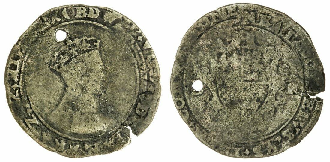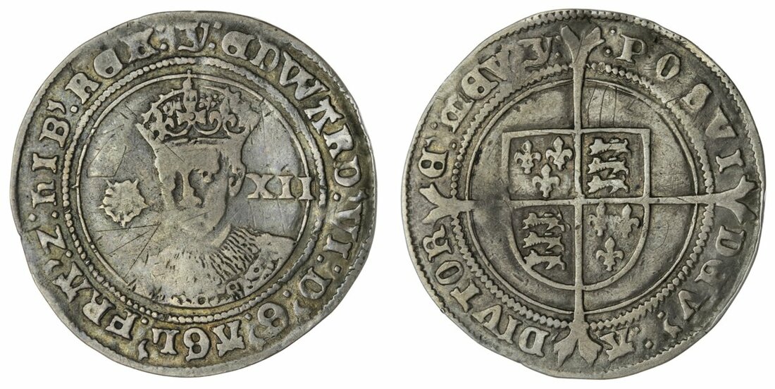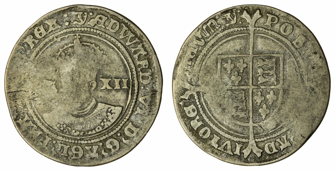 The Abramson Collection of English Coins | Edward VI (1547-1553), Shillings (3), Second Coinage, Durham House, 4.31g, 4h, m.m. bow (North 1925; Spink 2470), pierced and split, mediocre; also, Third Coinage, Fine Silver, Tower, m.m. y (2), 5.81g, 8h; 5.60g, 11h (North 1937; Spink 2482), one mediocre, the other with graffiti, otherwise toned, almost fine (3)