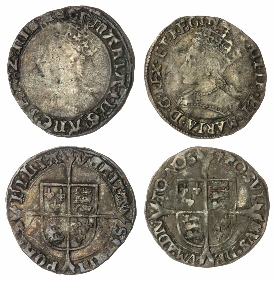 Mary, Sole Reign (1553-1554), Groat, 1.89g, 8h, m.m. pomegranate (Spink 2492), the portrait waterworn, otherwise fair / fine; another, Philip and Mary (1554-1558), Groat, 1.91g, 10h, m.m. lis (Spink 2508), slightly creased, otherwise fine, the reverse better (2)