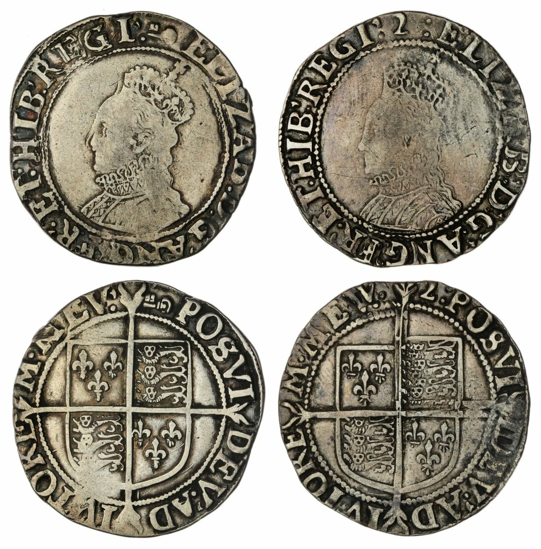 Elizabeth I (1558-1603), Sixth Issue, Shillings, Tower, bust 6b (2), 1595-1598, 6.24g, 11h, m.m. key (BCW KY-2/KY-b1; Spink 2577); another, 1602, 5.73g, 6h (BCW 2-1/2-a1 [Lis 96]; North 2014; Spink 2584), the first lightly cleaned, the second double struck with some staining, otherwise both fair to fine (2)