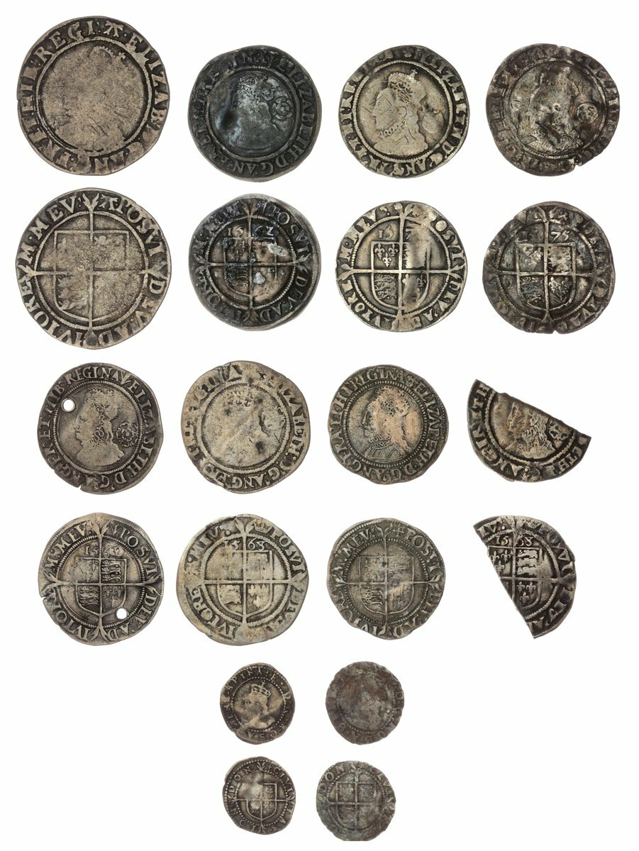 Elizabeth I (1558-1603), Mixed Hammered Coins (10), Shilling, 1582-1584, Tower, 5.40g, 2h, m.m. A (Spink 2577); also, Sixpences (6), 156Z over 1 (2 over 1), bust 1F, m.m. pheon; another, 1563 over 2, m.m. pheon (Spink 2561), pierced; 1568 over 7, m.m. coronet (2) (Spink 2562), one a broken half; 157[4], m.m. eglantine; 1575, m.m. eglantine (Spink 2563), most creased and waterworn, good to about fine; Groat, m.m. cross crosslet (Spink 2556), almost fine; lastly, Halfgroat, 1595-1598, m.m. key (Spink 2579); and, Penny, 1580, m.m. Latin cross (Spink 2575), full but creased flan, almost fine; an interesting academic group (10)