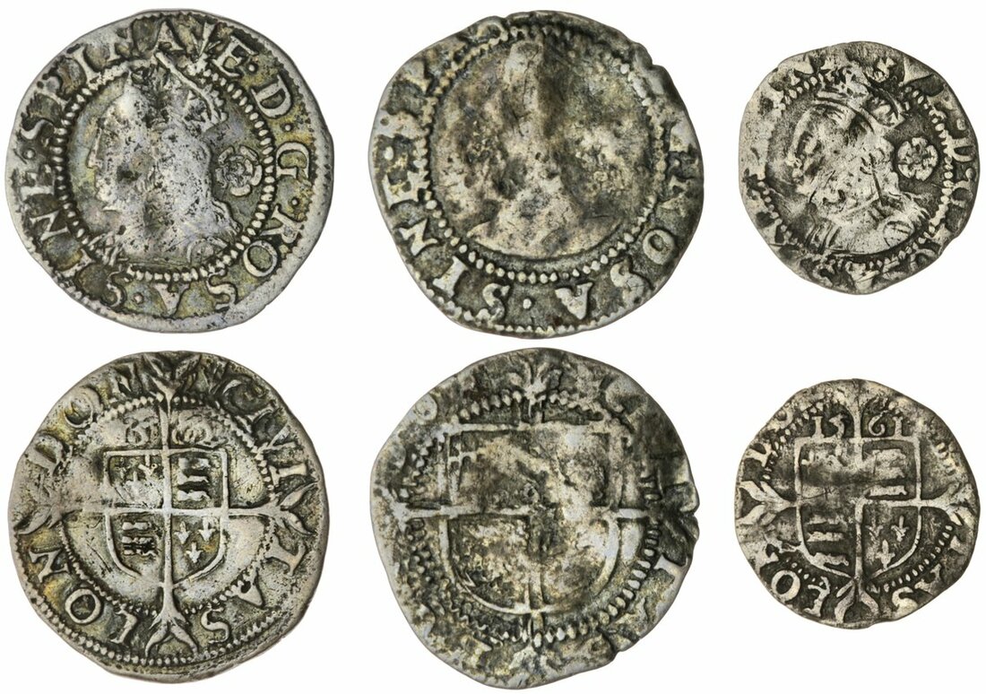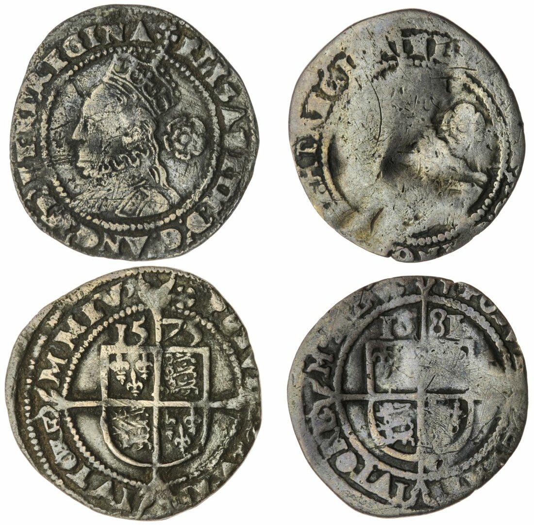 The Abramson Collection of English Coins | Elizabeth I (1558-1603), Threepences (2), Third and Fourth Issues, 1573, 1.34g, 4h, m.m. eglantine (North 1998; Spink 2566), slightly crimped, toned, fine; another, Fifth Issue, 1581, 1.33g, 5h, m.m. latin cross (Spink 2573), creased and flat, poor; additionally, Threehalfpence, 1562, 0.79g, 3h, m.m. pheon (North 2000; Spink 2659), toned, creased, fair; also, Halfgroat and Threefarthings, 1561, 0.33g, 2h, m.m. pheon (North 2002; Spink 2571), these both creased and fair (5)