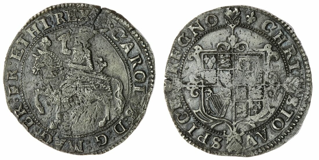 Charles I (1625-1649), Group I, Halfcrown, 1625, Type 1a², Tower (under King), King on horseback left, plume on head dress and atop caparison, no ground line, stops flank m.m., reads MAG BRI FRA ET HI REX, rev. (m.m.) CHRI | STO AV | SPICE | REGNO, square-topped and garnished shield over cross fourchée, 14.53g, 2h, m.m. lis (Hawkins 1a²; Francis 1a; Brooker 280 same obverse die; North 2202; Spink 2764), scruffy and lightly porous on account of being a reported river find, some minor striking splits to peripheries, otherwise about fine, rare