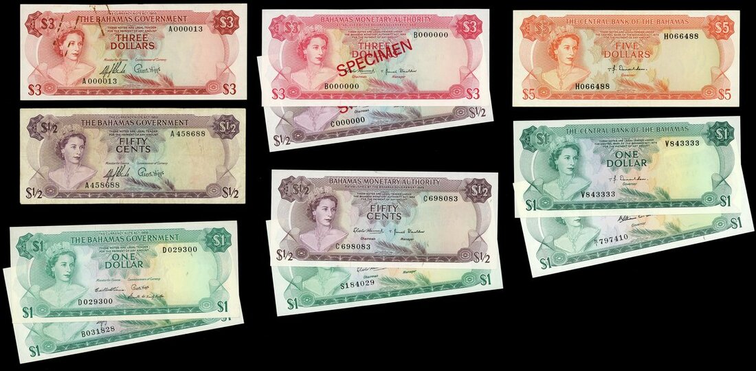 Bahamas Government issue, 50 cents, law of 1965, Monetary Authority, specimen 50 cents and an issued 50 cents, ND (1968), all purple, Elizabeth II at left, Government issue $1(2), 1965, also Monetary Authority $1, 1968 and Central Bank $1 (2), green, Government issue $3, 1965 with serial number A/1 000013, and a Monetary Authority specimen $3, red, also a Central Bank $5, orange