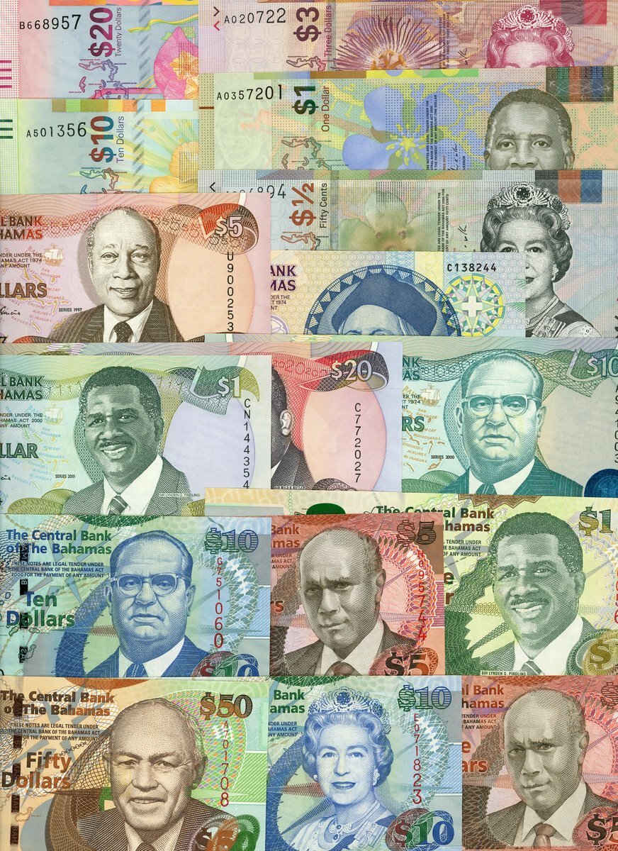 Central Bank of the Bahamas, $1, 1974, Columbus commemorative, $5, $10, $20, 1997-2001, $1, 2001, $1, 2008, $5 (2), 2007, 2013, $10 (2), 2005, 2009, $50, 2006, also 1/2, 1, 3, 10 and $20, 2016-2019