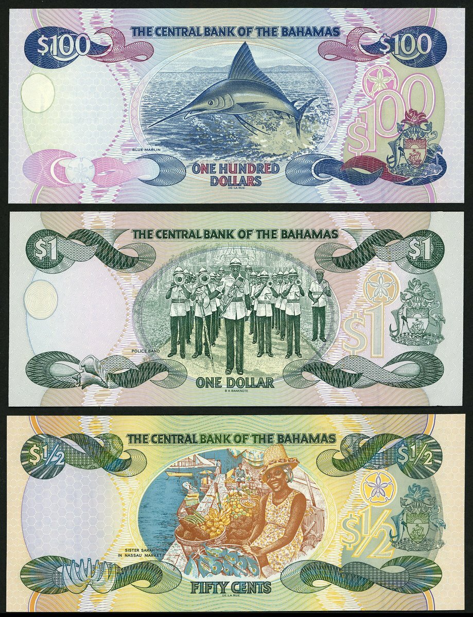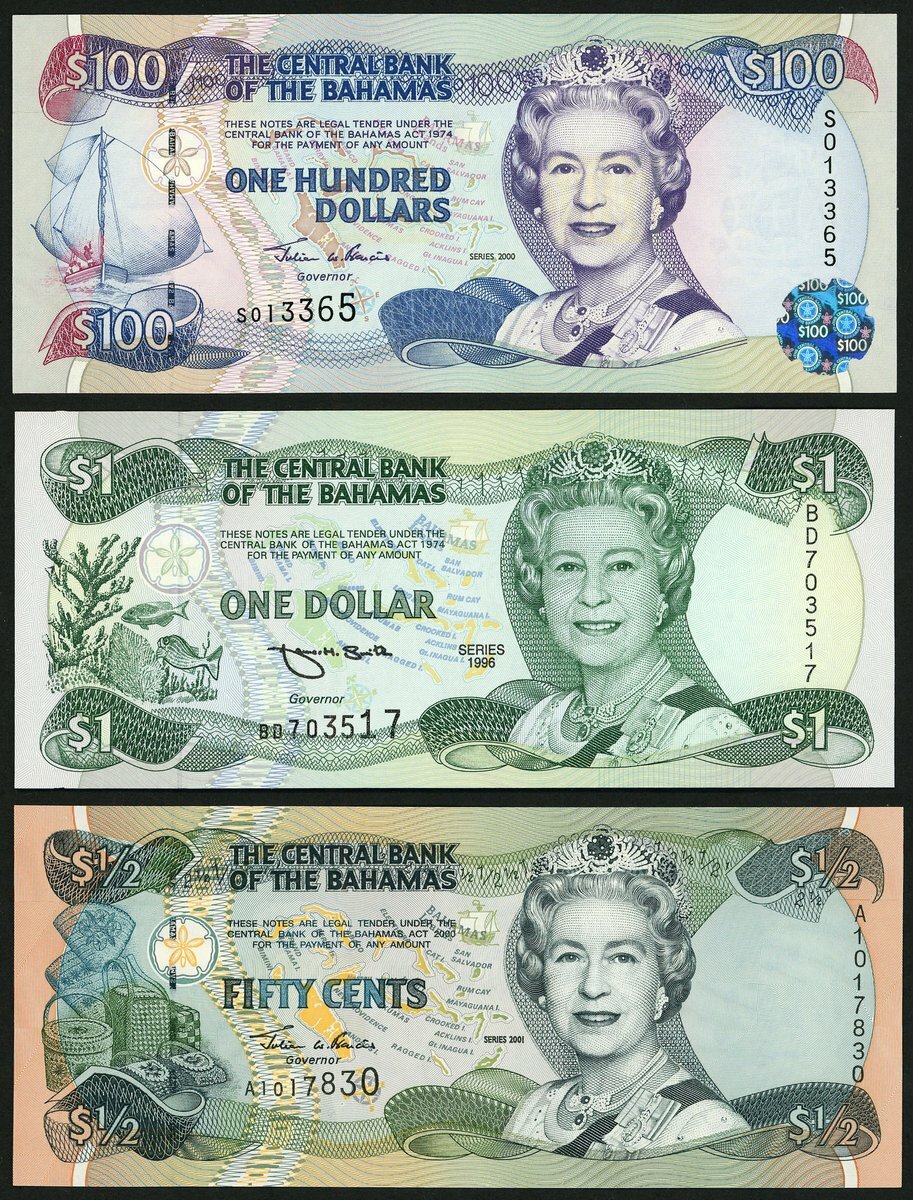Central Bank of the Bahamas, 50 cents, 2001, green, $1, 1996, green and $100, 2000, blue and violet, Francis signature, all Elizabeth II at right