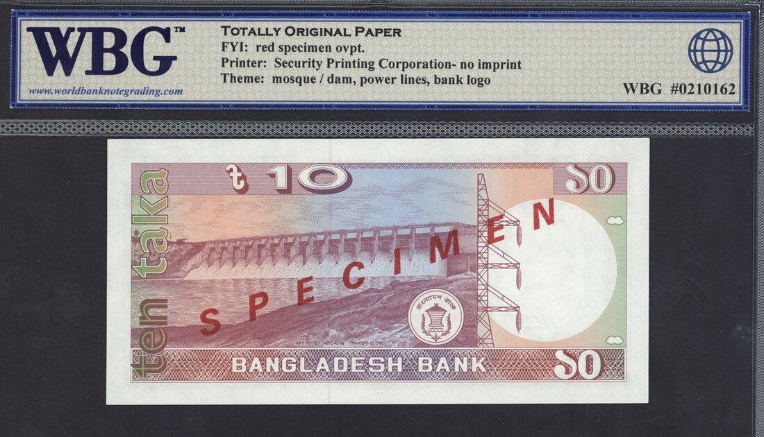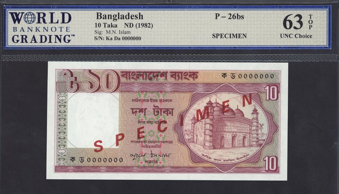(x) Bangladesh, specimen 10 taka, ND 1982, (Pick 26bs), in WBG holder 63 TOP UNC Choice