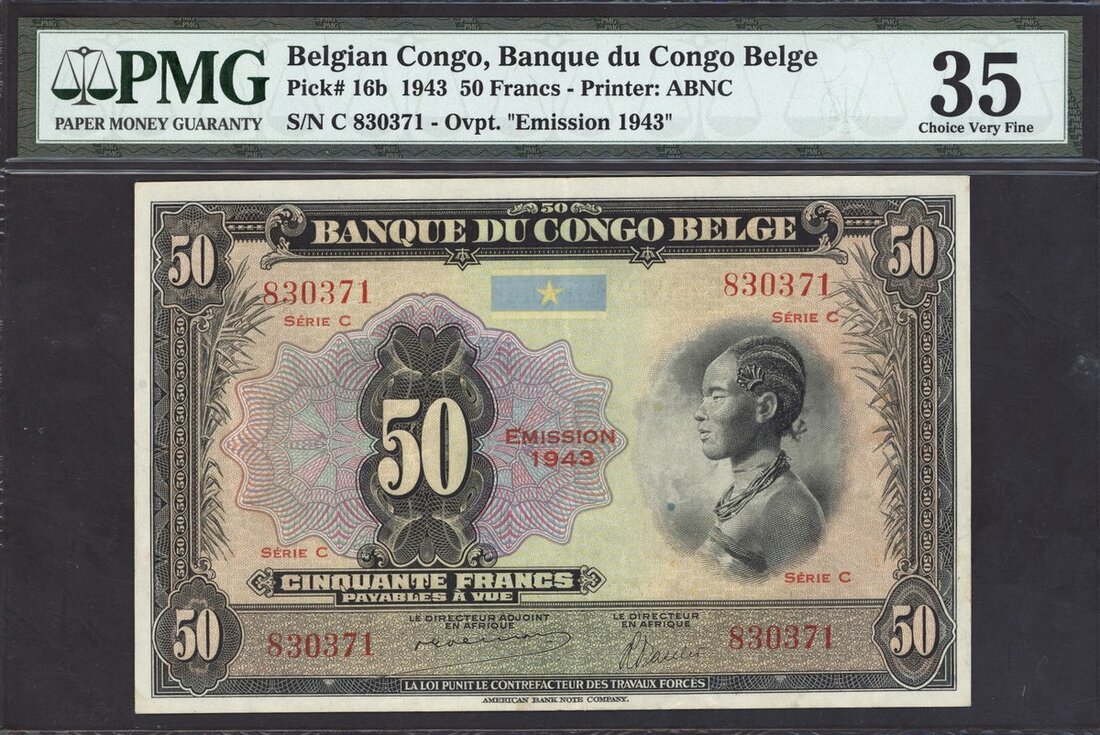 (x) Banque du Congo Belge, 50 francs, 1943, serial number 830371, series C, (Pick 16b), in PMG holder 35 Choice Very Fine