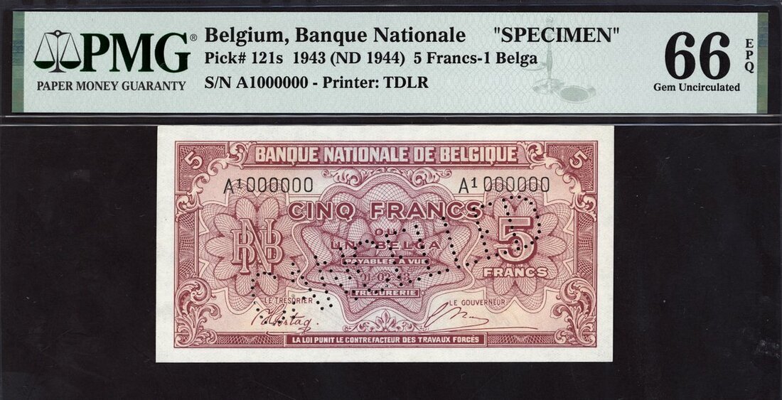 Banque Nationale de Belgique, Belgium specimen 5 francs/1 belga, ND (1944), prefix A1, (Pick 121s, TBB B599s), in PMG holder 66 EPQ gem uncirculated