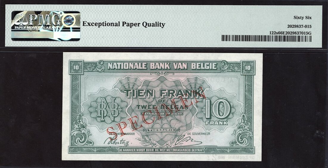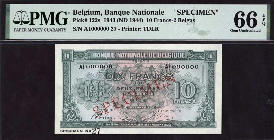 Banque Nationale de Belgique, Belgium, specimen 10 francs/2 belgas, ND (1944), prefix A1, (Pick 122s, TBB B570s), in PMG holder 66 EPQ gem uncirculated