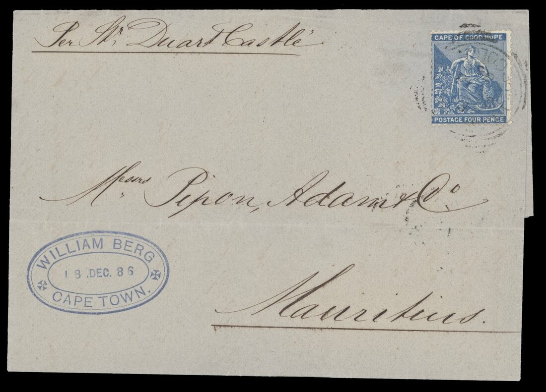 1885 (18 Dec.) entire letter from Cape Town to Mauritius, bearing 4d. tied by light squared-circle d.s. and showing arrival c.d.s. (2.1) on reverse