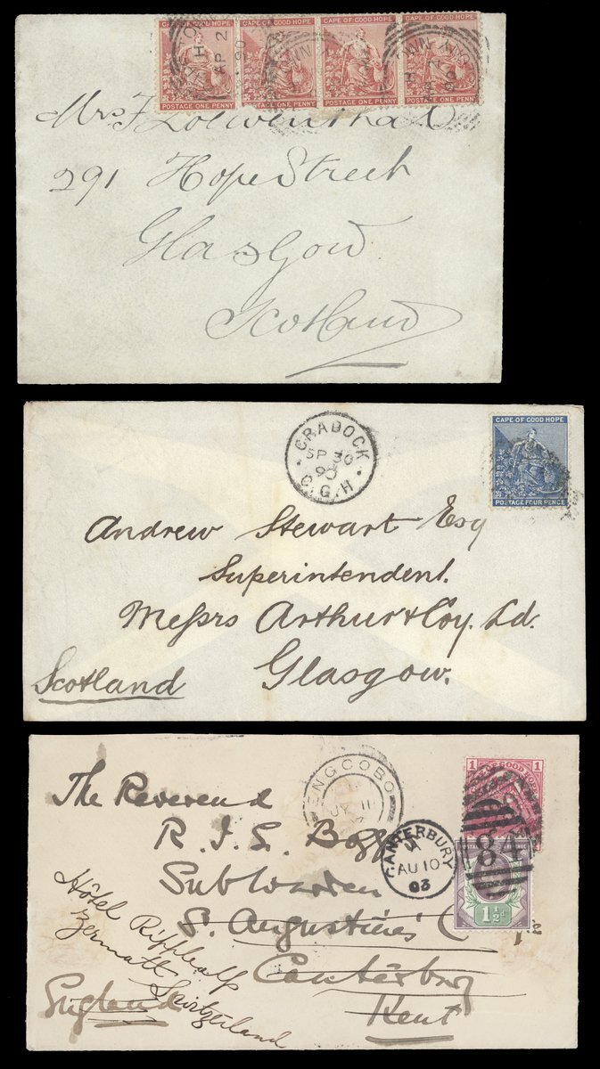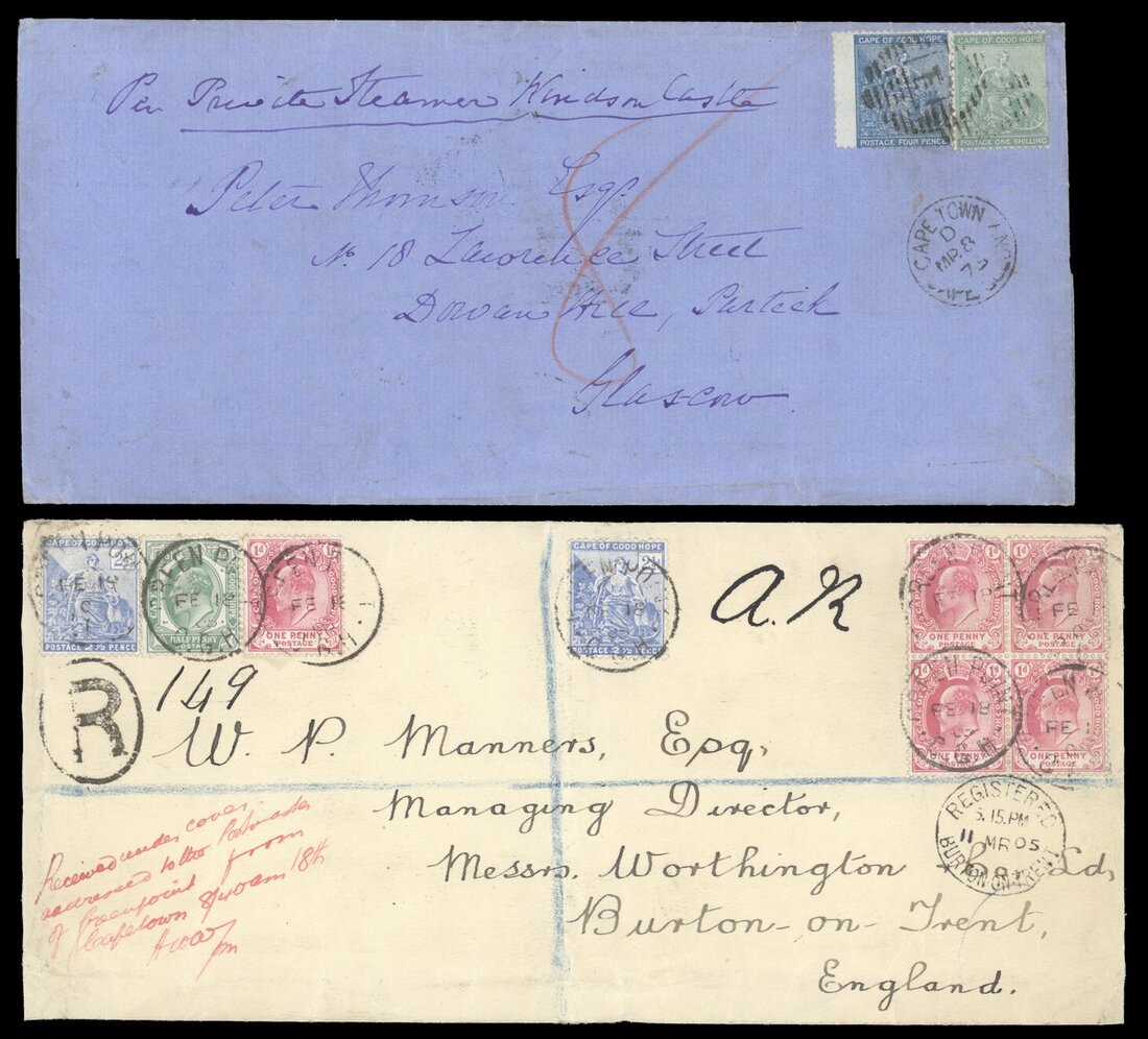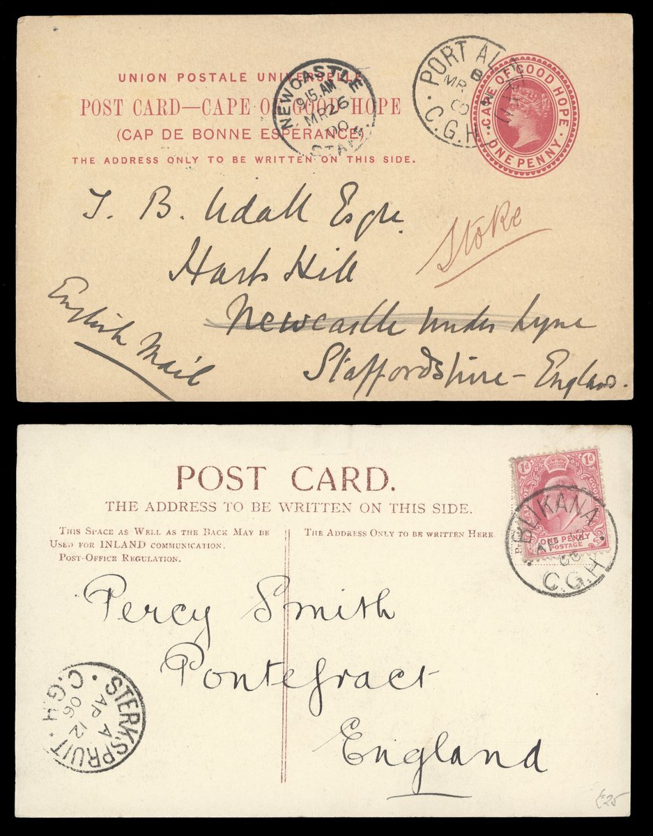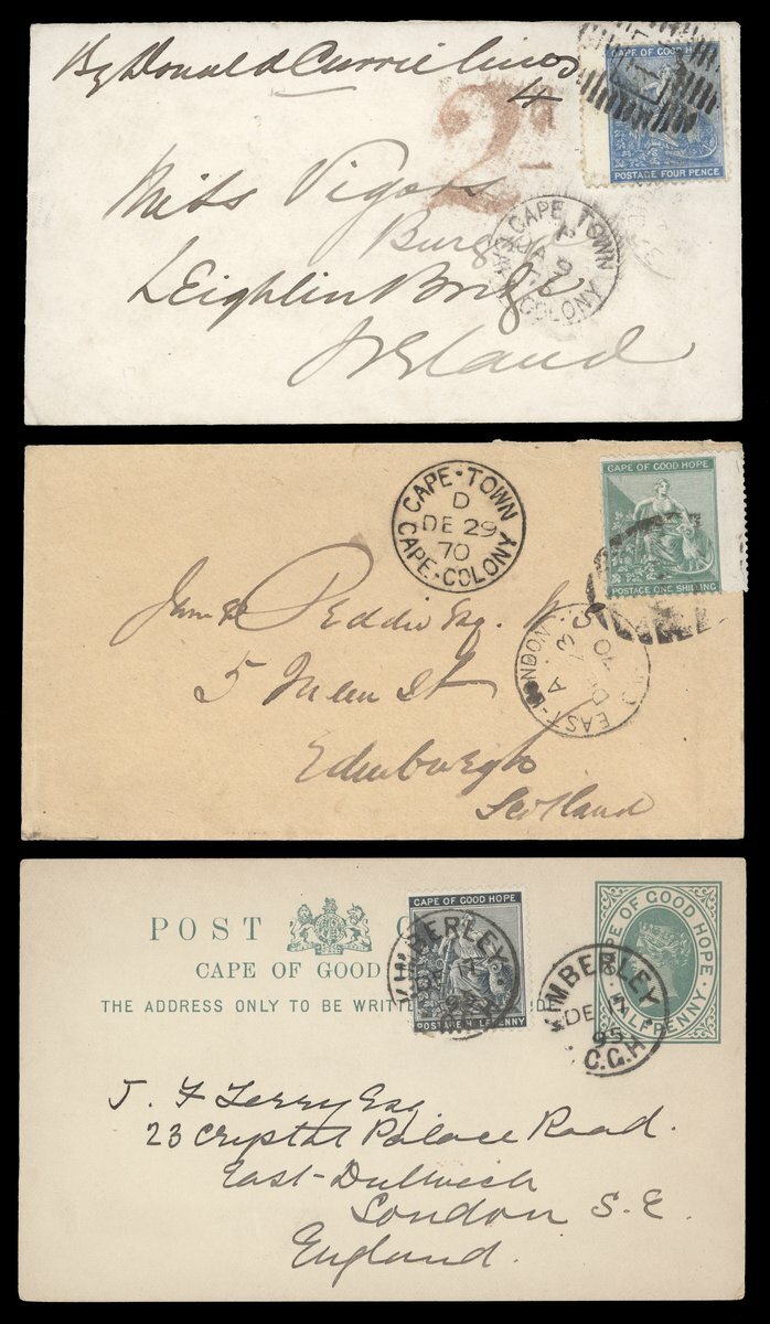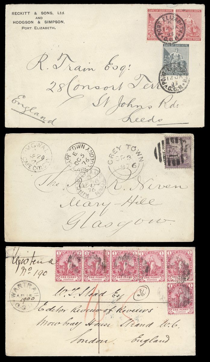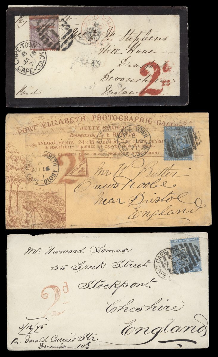 1870-1906 envelopes (13, one a Port Elizabeth Photographic Gallery advertising type and two registered), picture postcard and ½d. and 1d. stationery cards (the former uprated ½d.), variously addressed, the envelopes showing frankings of 1d. (with GB 1½d. applied upon redirection), 2½d., 4d. (6, for showing "2d" accountancy h.s. in red), 6d. (2, one registered), 10½d. (registered with manuscript "AR"), 1/- and 1/4d. A good lot