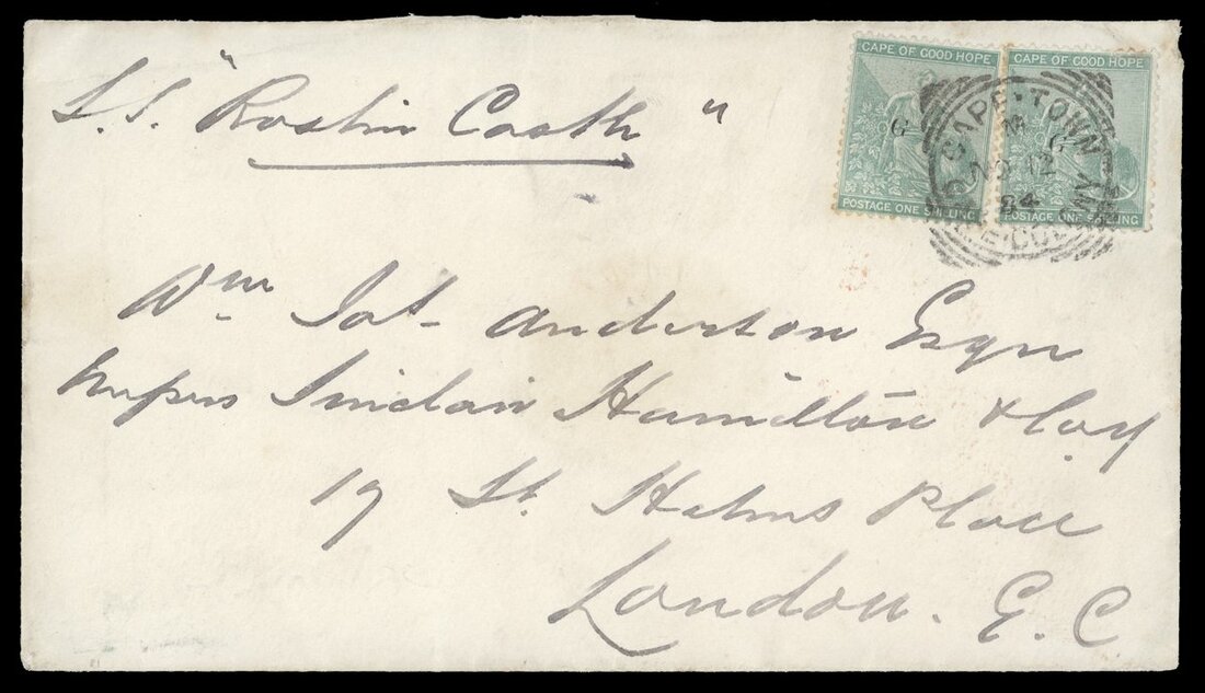 1884 (12 Nov.) quadruple rate envelope to London, bearing 1/- (2, both with some lightly toned perfs) clearly tied by Cape Town squared-circle d.s.  with red arrival d.s. (3.12) on reverse