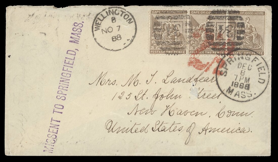 1888 (7 Nov.) envelope from Wellington to Connecticut, bearing 2d. strip of three clearly cancelled by barred numeral "34", showing despatch c.d.s., "2½d" accountancy h.s. in red (additionally tying the strip), straight-line