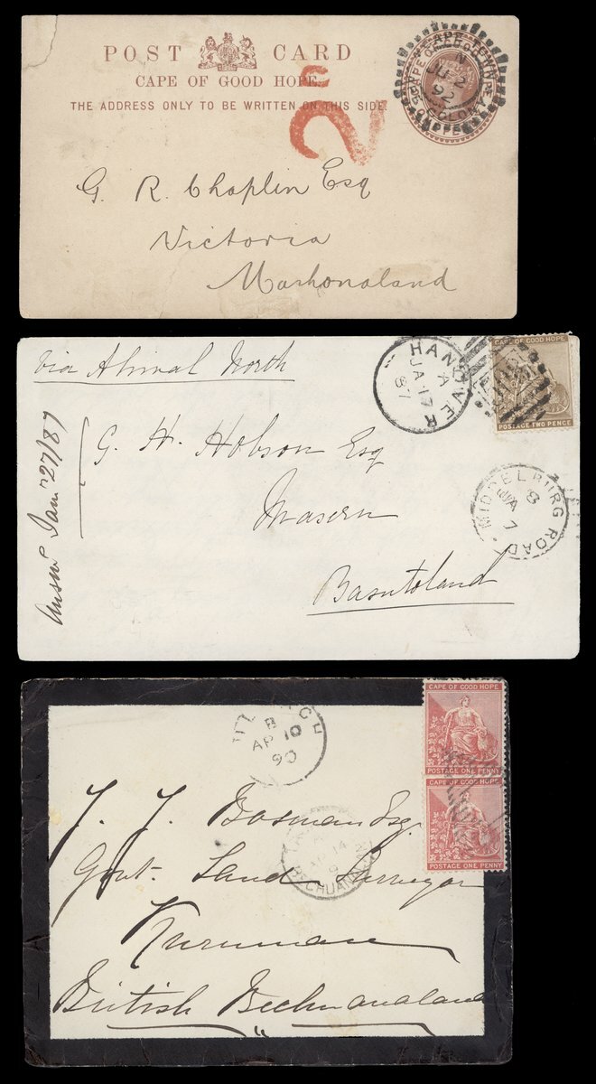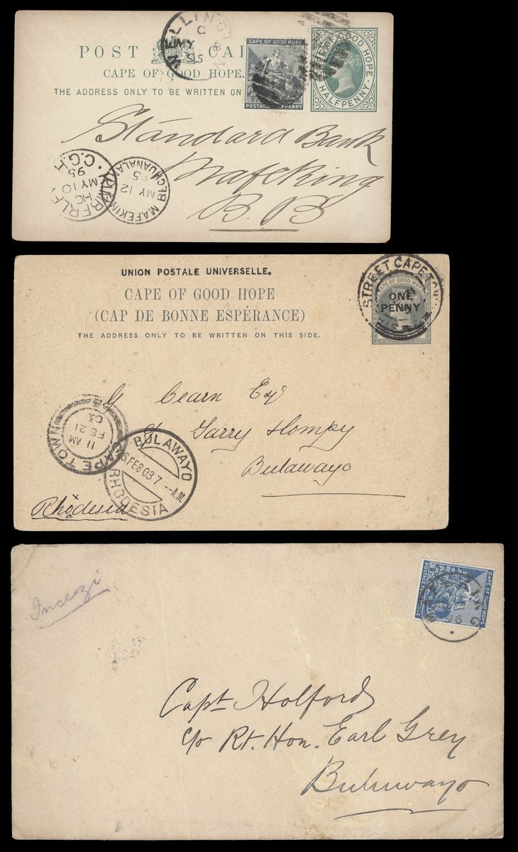 1887-1903 comprising 1887 envelope ex Hobson correspondence to Basutoland franked at 2d.; 1890 envelope franked at 2d. and 1895 ½d. stationery card uprated to Bechuanaland; and 1892 1d. stationery card cancelled by Cape Town Compass Point d.s. and showing red