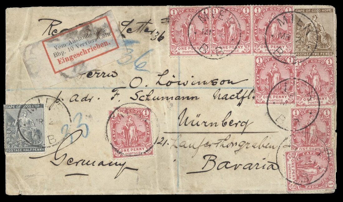 1896 (21 Mar.) envelope registered from Rietfontein to Bavaria, bearing ½d., 1d. (8) and 2d., all tied by