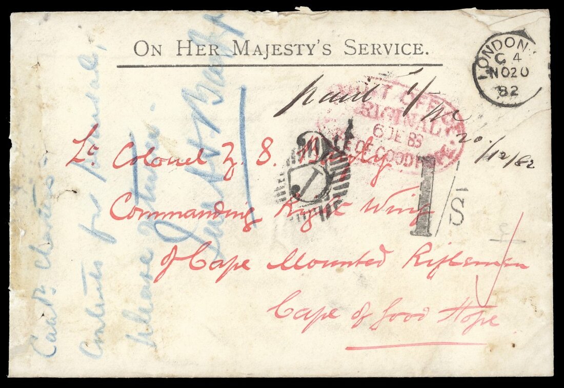 1882 (20 Nov.) OHMS envelope from London to to a soldier at King Williams Town, showing despatch c.d.s.,