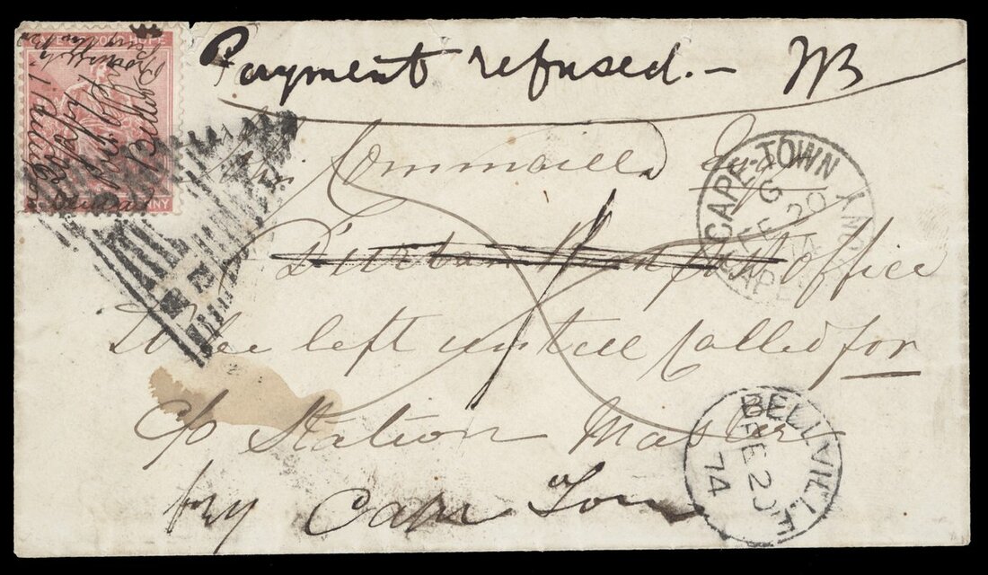 1874 (20 Feb.) envelope to Belleville, marked "To be left untill called for", bearing 1d. covered with manuscript notation and tied by triangular obliterator, endorsed "Payment refused" and "try Cape Town", showing Bellville and Cape Town c.d.s. on face. Most unusual