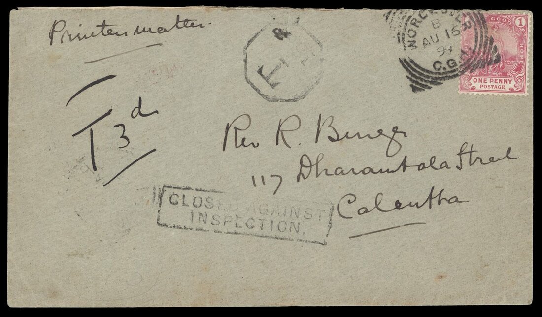 1894 (16 Aug.) envelope from Worcester to Calcutta, marked "Printed matter", bearing 1d. tied by squared-circle d.s., showing manuscript "T 3d", octagonal-framed