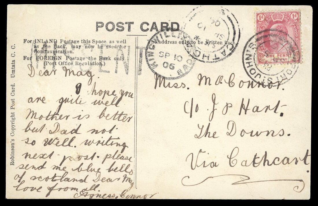 1906 (5 Sept.) picture postcard from Port St. John's to The Downs via Cathcart, showing large