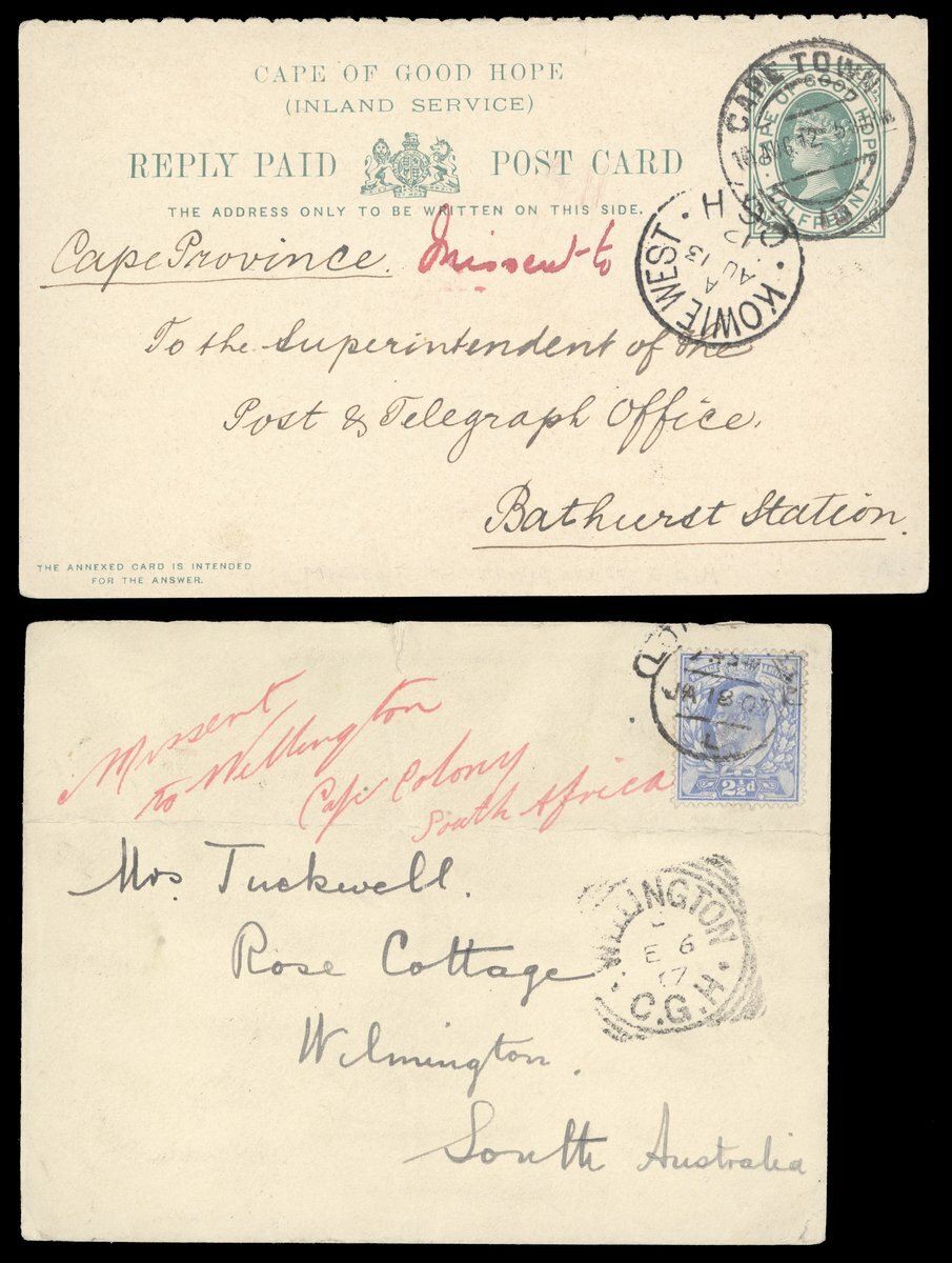 1907 (Jan.) envelope (flap missing and horizontal crease towards top) from London to South Australia, franked at 2½d. and showing manuscript "Missent to Millington Cape Colony South Africa" in red ink; and 1912 ½d. outward half of reply paid card from Cape Town to Bathurst Station, showing "Missent to" in red ink with Kowie West c.d.s. alongside.