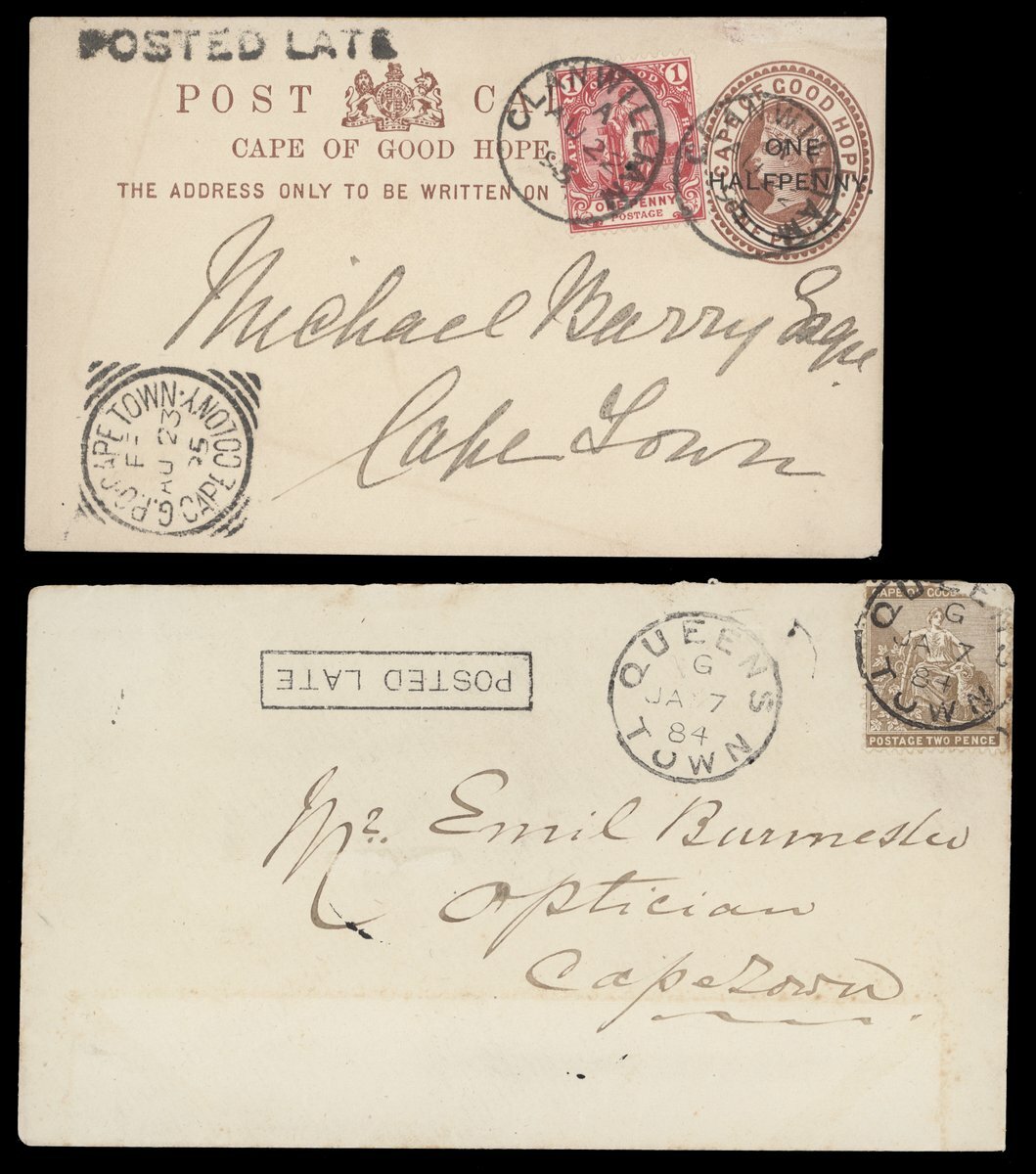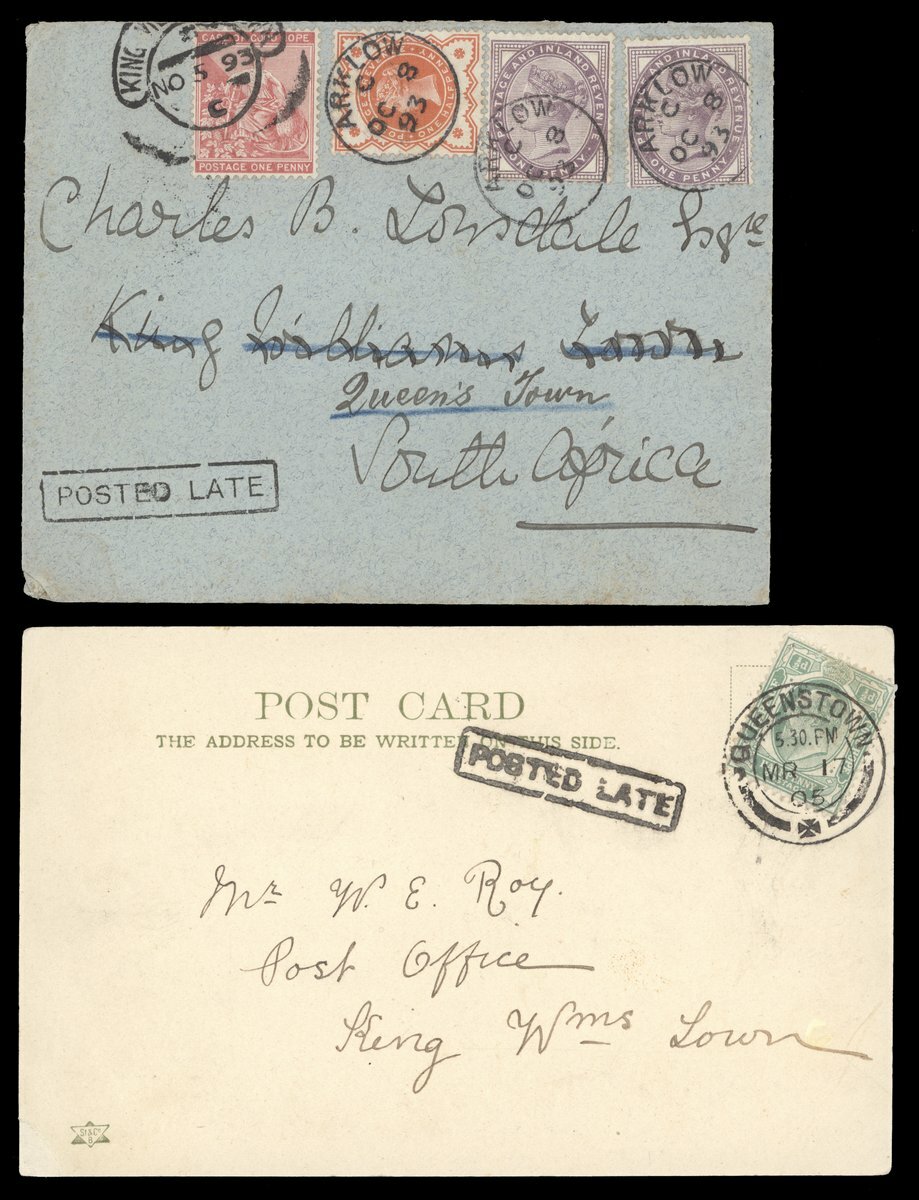 1884 (Jan.) envelope from Queenstown to Cape Town franked at 2d., 1893 (Oct.) envelope from England to King Williams Town and redirected to Queenstown, franked at 2½d. plus Cape 1d for redirection, and 1906 (17 Mar.) picture postcard from Queenstown to King Williams Town franked at ½d., each showing framed