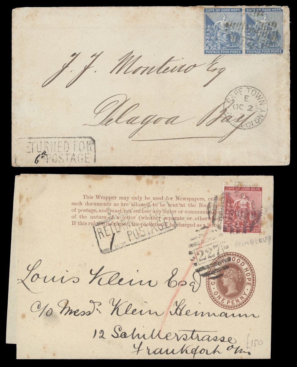 Undated 1d. wrapper from Kimberley to Germany, uprated with 1d. and cancelled by barred numeral "227", and 1877 envelope from Cape Town to Delagoa Bay franked at 8d., both showing framed